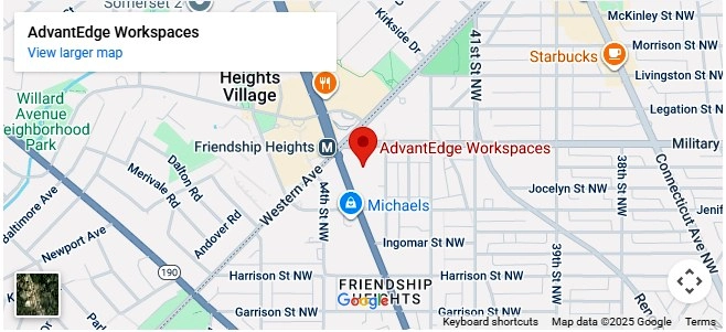 AdvantEdge has two prime locations in Washington, D.C.: Downtown DC at 2101 L St. NW and Chevy Chase Pavilion at 5335 Wisconsin Ave. NW. These locations provide easy access to major business districts, transportation hubs, and amenities, making them highly convenient for professionals. The Downtown DC location offers floor-to-ceiling windows and an open rooftop fitness center, while the Chevy Chase Pavilion location is directly accessible via the Metro and is surrounded by a vibrant commercial neighborhood (More Frequent Questions ).